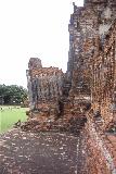 アユタヤに着いたのは9:00頃です。 シャングリラホテルから、約1時間の道のりでした。 アユタヤは、チャオプラヤ川とその支流の間の中ノ島にある遺跡で、14世紀中頃〜18世紀中頃に栄華を極めたアユタヤ王国の遺跡です。 35代も続いた王朝ってすごいですよね。 さぞかし華やかだったんだろうなぁ。 アユタヤに着いてバスを降りると、どちらを見ても遺跡、また遺跡です。 レンガや石を積んで作った建物や壁が、あるものは原型をとどめて、またあるものはほとんど残骸になって点在しています。 ガイドのおっさんから注意事項と集合時間を告げられ、私たちはしばし自由に散策しました。 私たちに対しては、他のツアー参加者よりも、ゆっくりゆっくり丁寧にしゃべってくれたのは、おっさんの親切心でしょうか。 それとも私たちが行方不明になって、責任とるのがイヤだったんでしょうか(笑 それにしても暑いっ。 しかもただ暑いんじゃなくて、べとーっとしてひじょーに蒸し暑いっ。 ちょっと歩くだけで汗がだらだら流れてきます。 よかった、ミネラルウォーター持って来てて。 東南アジアに行くといつも思いますが、ほんと、ミネラルウォーターは必需品ですね。 持ち歩かないと脱水症状になっちゃいますよ、東南アジアは。 30分ほど散策してバスに戻り、また別の場所に移動して散策です。 え? どこを散策したのかって? そんなこと聞かないでくださいよぉ。 何しろガイドのおっさんの話はほとんど聞き取れないので、どこ歩いたかよく分かんないんです (^^;;; とりあえずアユタヤです〜 (笑 しかしアユタヤは素晴らしいとこですね。 説明なんか聞かなくても、なんとなく見てまわるだけですごく楽しい。 お寺が好きで奈良や京都を1人でまわったこともありますが、石造りの遺跡はまた違った趣で、とても美しく哀しいものでした。 |