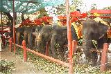 さて次にバスを降りたところには、なんと 「象乗り場」 がありました。 たくさんの象さんが並んでいます。 ここでガイドさんの話があり、希望者は象に乗れるんだそうです。 もちろん別料金ですが。 象乗り場に近づいていくと、かわいい小象くんがいて、いっしょに写真を撮れるようです。 こりゃ撮らなきゃと思って行ってみると、有料でした。 たしか100バーツだったと思いますが、定かではありません(^^;;; そこで管理人の管理人が、小象くんといっしょに記念撮影することにしました。 すると小象くんはちゃんと前足を椅子にして、準備してくれます。 慣れたもんですね。 そして鼻をあげて、はいっ、ポーズ。 その後は、もちろん象に乗りました。 エレファントライドってやつですね。 たしか1人400バーツ(1200円)だったと思います。 地上1.5mくらいの高さの木組みの乗り場にのぼり、横付けした象さんに乗ります。 象さんの背中には木の椅子がしつらえてあって、大人3人が並んで座れるくらいの広さがありました。 象さんの頭を踏んづけなきゃ椅子に座れないのでちょっと躊躇していたら、ここを踏んでのぼれ、と頭を指差してくれました。 なんか頭を踏むってのが抵抗ありましたが、象さんにとっては蚊が刺したほども感じないのかもしれませんね(笑 さて象さんが動き出すと、うぉっ、揺れる揺れる。 のっしのっしと歩くたびに、前後左右にぐぃーんと持ってかれる感じです。 うーむ、決して乗り心地がいいとは言えないな・・・。 象さんは歩いて広場を1周しました。 なんだ、これで終わりかいっ、と思ったら、そうじゃなくて象さんは柵の間から道路に出て行きます。 どこまで行くんでしょうね〜。 途中ガイドのおっさんがいて、私たちのデジカメで撮ってくれました。 が、なんでこんなにヘタクソなんでしょ。 難しいカメラじゃないのに・・・。 その後も象さんは、のっしのっしとどんどん歩いていきます。 すると、他のツアーメンバーが乗った象さんが見えてきました。 おぉ、追いつくかもしれない、と思ってたら、なんと私たちの乗った象さんはダッシュかけてます。 壮絶なデッドヒートになっちゃいました(笑。 向こうのツアーメンバーも気がつき、「GO!」だの「HURRY」だの大騒ぎです。 もちろん私たちも「行けーーっ」だの「追いつけーっ」だの大騒ぎしました(笑。 ただでさえ乗り心地悪いのに、ダッシュなんかかけるから椅子から振り落とされそうなほど揺れます。 結構真剣に手すりにしがみついちゃいました(汗。 そして、ついに追い抜いて1着〜〜〜っ。 ってなんで象レースになっちゃったんでしょう(笑。 エレファントライドは20分くらいで終わり、乗ったとことは違う場所で降ろされました。 えっ? と思ってたら、ちゃんとガイドさんが待っていてくれて、バスに案内してくれました(あたりまえか。 |