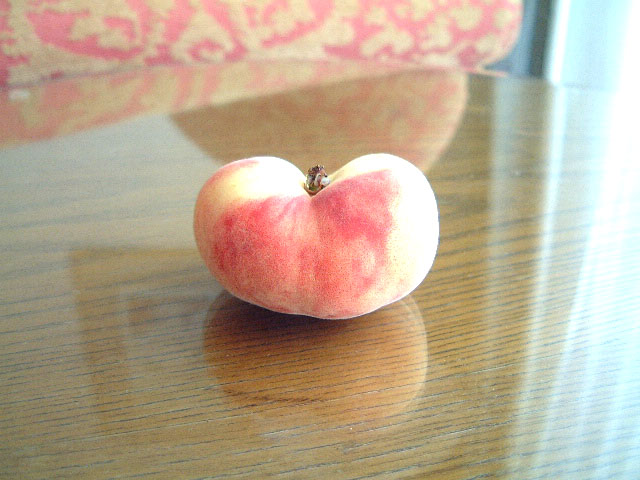 私の鳥そぼろ弁当のお味は・・・・残念ながら、う〜んって感じです。使っているのは日本の米なのですが、柔らか過ぎるくせに芯があるような・・・・・。炊き方に問題があるのかなぁ。具は美味かったですが。 おにぎりのご飯も似たようなもんだったそうです(奥様談)。 さて不思議な形の Donut Peach ですが、こちらは食べてみると味も食感も普通の桃だそうです(奥様談)。隣りで売られていた普通の桃の値段が 2.3ドル、Donut Peach も 2.3ドル。ということは、小さいぶん損した感じですね(笑)。