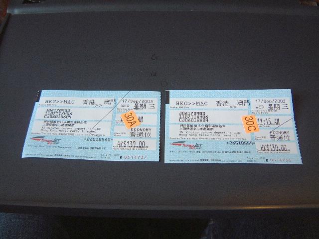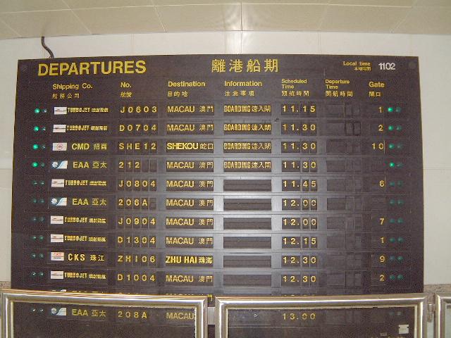 この運行掲示板を撮影していたら、警備員が近づいてきて 「写真を撮るな」 と言われました。 たかが運行掲示板なのに・・・。 なんでだろう。 私たちは 11:15 のチケット(1人 $130.00 : \1,950)を購入し、さっそく乗船しました。 フェリーは全席指定で、チェックインのとき座席番号のシールを貼ってくれます。 この座席番号が、となりどうしなのに A と C なんですよね。 なんでだろう。 疑問をかかえながら、フェリーは出航しました。 約 1 時間でマカオに到着です。 |