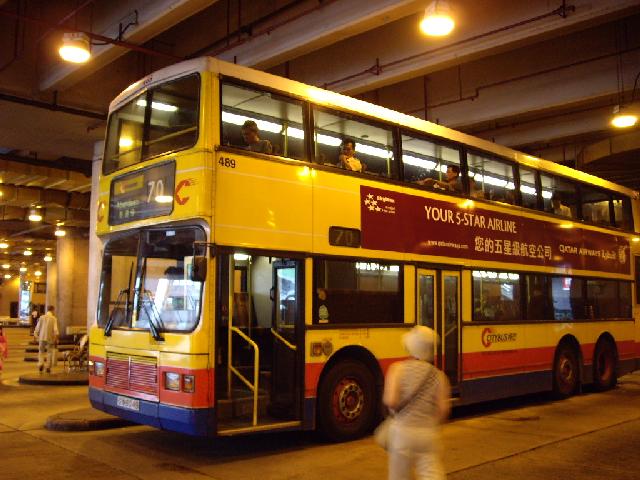 味もそっけもないコンクリートの建物が見えてきたら、それが巴士站です。 入ってすぐのところはミニ巴士の乗り場、その奥がダブルデッカーの乗り場になっています。 ダブルデッカーの乗り場には、巴士の案内図があります。 しかしこの案内図は、目の前にある巴士乗り場の案内図ではありません。 私はこの案内図を見たとき、てっきり目の前の巴士乗り場の案内図だと思い、香港仔行きの70番が載っていないのであせりました。 しかし管理人の管理人がすぐに気付き、迷わないで済みました。 管理人の管理人、偉いっ。 さて状況は理解できたのですが、70番の乗り場がよく分かりません。 そこでチケット売り場のおばはんにガイドブックに載っている 「香港仔」 を見せたら、そのおばはん、やおら電卓を取り出しました。 そして 「70」 と打ってこちらに見せます(笑 分かりやすいですね・・・・・じゃなくてぇ、70番に乗ればいいのは知ってるわけでぇ、どの乗り場から出るかを聞いとんのやっ。 語学力がないって、悲しいですね。 しかし私たちはツイてます。 ふと振り返ると、そこには70番の巴士が。 写真を撮って乗り込むと、さらにツイていました。 2階の先頭座席が空いてます。 |