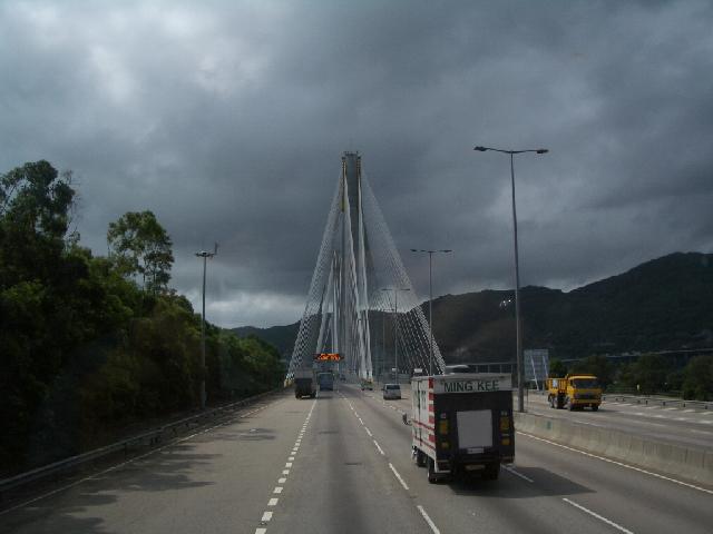 巴士はすいてます。 八達通(オクトパスカード)で料金13ドルを払って期待しながら2階に上がってみると、最前列が空いてる!! ラッキーですね〜、すかさずゲット。 私たちと "苦労" を乗せた巴士は、しばらく彌敦道(ネーザンロード)を北上し、油麻地(ヤウマティ)付近で左折しました。 そして裏道をクネクネと走り、気が付くと高速道路に入ってます。 時刻は 14:55 です。 おや? この道路見たことあるな。 どうやら空港に向かう高速道路のようです。 後から地図で調べてみたら、当たってました。 高速道路は快適ですね〜。 交通量も多くないし、車線は広いし。 でもちょっと全体的に路面が荒れている感じで、細かい揺れは感じました。 巴士は青衣(ツィンイー)まで高速道路を走り、青衣で高速道路を降りて屯門・元朗方面に向かいます。 青衣は島で、対岸の汀九(ティンカウ)へ大きな橋が架かっていました。 なかなか立派な橋です。 汀九からは、海沿いを西に向かって走ります。 左手には空港へ向かう高速道路の橋、青馬大橋(ツィンマーブリッジ)が見えました。 この橋は上層が道路、下層が鉄道になっていて、二層式では世界最長クラスなんですって。 いい天気なので、橋がくっきりはっきり見えます。 なかなか綺麗な景色ですね。 巴士は 15:30 ごろ屯門の市街に入りました。 市街に入るとすぐ、輕便鐵路(LRT)が走っているのが見えます。 あれに乗るにはどこで降りたらいいんだろう・・・ どうしよう、もう降りようか、いや、とりあえず巴士の終点まで行ったほうがいいんじゃないか、などと迷っている私たちを乗せた巴士は、街なかをぐるぐる走ります。 そして 15:40 ごろ屯門巴士ターミナルに着きました。 結局終点まで乗ってしまったようです。 いやぁ、いろいろあったけど、無事屯門に着くことができました。 フェリーがないのが分かったときは諦めようかという空気もありましたが、めげずに目的完遂です(えらいゾ、自分たち |
