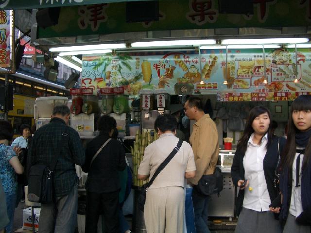 | 蛋の焼き菓子発見 | さて食べてみたかった蛋の焼き菓子ですが、少し歩いたらすぐに発見。 トラム道に面したスタンドのようなお店で売っていました。 ポピュラーだとは聞いていましたが、ほんとにそこいらで売っているんですね。 さっそく購入~($10.00)。 ピーナツクリームを塗ってくれると聞いていたので、店の奥にあるそれらしきものを指差して塗るしぐさをしてみましたが、これは却下されました。 なんでだろ。 焼き菓子を買ってふと見ると、おあえつらえむきに隣がジューススタンドです。 のども渇いていたのでそちらでマンゴージュースとスイカジュースを買い、銅鑼灣の雑踏の中でおやつタイム。 焼き菓子をちぎってほおばってみると・・・ほぉ、いかにも駄菓子って感じですね。 なんというか、パンとクレープを足して2で割ったような食感で、甘さは控えめ。 これ嫌いじゃないなぁ。 ってゆーか、わりと好き!! 次はジュース。 こちらはかなり濃いですね。 飲んだ瞬間に、「まんご~!!」、「すいか~!!」って感じです(こんな説明で伝わるかな・・・ ちなみにジュースはどちらも甘すぎ。 もっとさっぱりさせたほうがいいのに。 香港では甘いものは徹底的に甘くする傾向がありますが、このジュースも例外ではありませんでした。 おやつしながら時計を見ると 15:35、周りはすごい雑踏です。 人がわんさか行き交い、大量の車が走り、トラムが走り・・・。 学校や仕事があるはずの時間なのにこの人混み。 どうなってんだ、香港は? なおジュースはくどすぎて飲みきれませんでした(ごめんなさい。 |