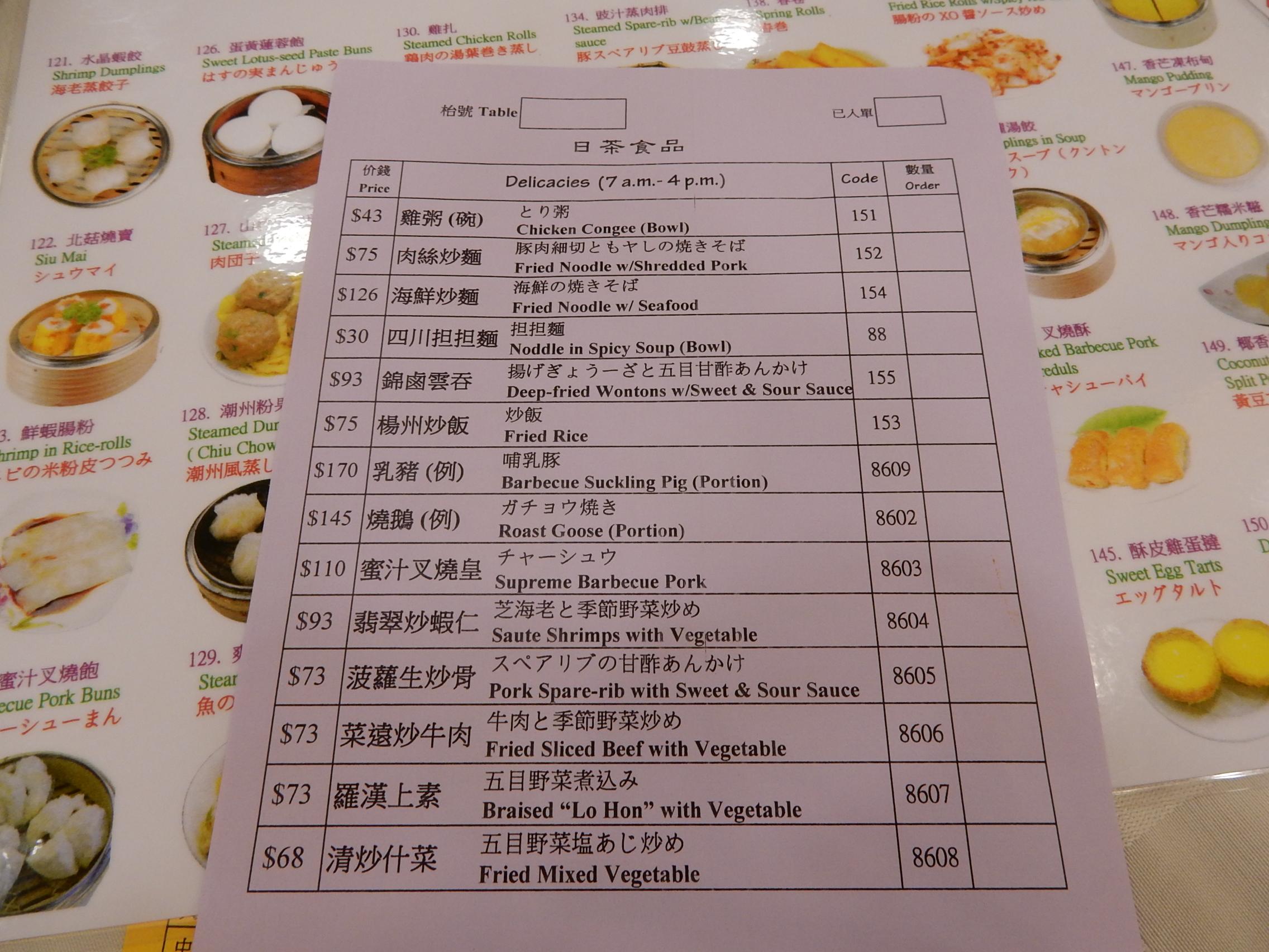 | 旺角の倫敦大酒樓へ | さて時刻は 12:28、そろそろお腹が空いてきました。 出かけることにしましょう。 向かうのは旺角なので、MTR で行きます。 いつものように地下道で尖沙咀駅に行き、12:40 ツェン灣行きの電車に乗りました。 旺角までは 3 駅で、着いたのは 12:46 ごろです。 倫敦大酒樓は旺角駅の少し南、彌敦道の東側にあります。 私たちは旺角駅でいちばん南にある E2 出口から出て、彌敦道を南に向かいました。 するとほどなく歩道に突き出した看板を、そして見覚えのある倫敦大酒樓のエントランスを発見。 10 何年前と変わってませんね。 12:55 ごろ入店です。 倫敦大酒樓は建物の 3F と 4F のツーフロアで、エレベータで上がります。 広いエントランスには 3 基のエレベータがあり、重慶大厦と違ってどれに乗ってもオッケー。 私たちは少し迷って 4F に行くことにしました。 4F に上がってエレベータを出るとスタッフが声をかけてきました。 「ん? 何?」 広東語なので内容は分かりませんが、どうやら「3F に行ってください」と言っているようです。 なんでだ? 事情はよく分からないまま、もう一度エレベータに乗って 3F に行きました。 ひょっとして 4F は予約専門なのかもしれませんね。 3F でエレベータを降りると、おお、相変わらず活気がありますね。 お客さんが溢れていて、たくさんのスタッフが動き回っています。 そして通路を行き交っているのはワゴン。 10 年以上前に来たっきりですが、この雰囲気当時と全く変わってません。 どうしようかと立っている私たちを目ざとく見つけたスタッフが近づいてきました。 そしててきぱきと席に案内してくれます。 なかなかスピーディでいいですね。 案内された席はもちろん相席。 香港では相席が当たり前なので私たちももう慣れました。 先客は 40~50 才くらいの男性が2人。 すでに何か食べています。 席に案内してきたスタッフに普洱茶(ポーレイチャ)を注文して着席。 すでに食器セットが用意されていました。 なんかこのお店って懐かしい感じ。 さっそく普洱茶を飲みましたが、とっても美味しい。 香港では香片茶(ジャスミンチャ)がポピュラーですが、私たちは2人ともあまり得意ではありません。 個人的に大好きなので私が普洱茶をよく飲んでいたら、管理人の管理人も好きになっちゃったみたいです。 なお "普洱茶" の発音ですが、香港では "プーアル" ではなく "ポーレイ" と発音したほうが通じやすいですね。 テーブルにはメニューが用意されていました。 3枚ありましたが、2つは日本語が併記されています。 こんなの以前来た時にはありませんでした。 日本語対応が進んでいるのですね。 写真付きメニュー1 写真付きメニュー2 メニュー3 それではここで料理の注文方法を紹介しておきましょう。 倫敦大酒樓は旧き良きワゴン形式をメインに、他にもいろいろな注文の仕方ができる飲茶店です。 ワゴンの場合、通路を行き交うワゴンを停めてセイロやお皿の蓋を取って内容を確認し、欲しければチェックシートを渡してその料理をもらうシステム。 取った料理の種類に応じてスタンプが押されます。 ただ席で待っているとなかなかワゴンが回ってこないので、チェックシートを持ってワゴンまで行っちゃいますけどね。 フロアの端には、ワゴンで提供されていない料理を出してくれるブースがあります。 そこではレタスを茹でた生菜などが提供されているようです。 この場合も料理をもらいに行くときにはチェックシートが必要。 またそれ以外の料理を、オーダーシートを使ったり口頭で伝えたりしてスタッフに直接注文することもできます。 それにはテーブルにあるオーダーシートを使うのですが、日本語が併記されているので安心ですね。 オーダーシートは2枚ありました。 なおこの場合ももちろんチェックシートにスタンプが押されます。 オーダーシート1 オーダーシート2 以上が倫敦大酒樓での注文方式です。 初めてだと少しとまどうかもしれませんが、日本語にもずいぶん対応してますし何とかなるレベルでしょう。 基本はチェックシートなので、これさえ忘れなければ大丈夫です。 さて私たちはどうしたかと言うと、とりあえず最初はワゴンを攻めます。 管理人の管理人がチェックシートを持って、ワゴンをチェックしに行きました。 ちょっとすると料理を取ってきました。 積極的ですね。 このとき取ってきたのは、蝦の腸粉・蝦の水餃子・大根餅・排骨の豆豉蒸です。 いやあ、どれも美味しいですね。 間違いない美味しさです。 食べたものを見て「いつも同じもの食べてるじゃん」と思うかもしれませんが、ついつい好きなメニューに偏ってしまいます。 食べたことのない料理に挑戦するのは、また別の機会にしましょう。 取ってきた料理を美味しくいただいていた管理人ですが、相席の男性が食べている料理が気になって仕方ない。 「あの叉焼みたいなの、すっげぇ旨そうだなぁ。 あれ食べたいなぁ」 メニューを調べてみまし