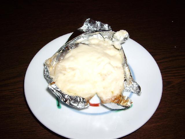 | 6.ホワイトソースのグラタン | シーフードと椎茸のホワイトグラタンです。 アルミホイルを箸で破って食べます。