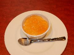 よく熟したトマトのムースにマンゴーソースをたっぷりかけ、生マンゴーの角切りをトッピングしたオードブルです。 とてもかわいらしいルックスですね。 スプーンを深く入れ、ムース・ソース・マンゴーを一緒にすくい取って食べるととても美味しい。 マンゴーの甘みが去った後に、トマトのほのかな酸味がじわじわとやってきます。 夏らしい一品ですね。 |
