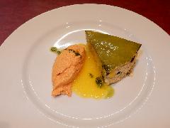 すごく手の込んだ料理です。 ベーコン、タマネギ、卵、牛乳、生クリームでムース状のものを作り、それとちりめんキャベツ&ほうれん草をミルフィーユのように重ねています。 お菓子仕立ての名の通り、ほんとにケーキみたいです。 コンソメベースでサフランの風味を加えたソースがすごく合っていて、めっちゃ美味しい。 隣のサーモン色のものはトマトのムース。 これもミルフィーユに負けず劣らず美味しいです。 |