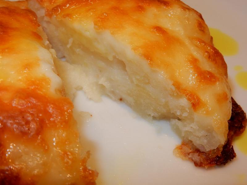マッシュポテトくらい柔らかめのポテトグラタンに、ウナギのかば焼きが入った料理です。 ホールケーキのように成形した状態から切り出してあるので、ケーキのピースのような外見ですね。 添えてあるかば焼きのタレがベースのソースを付けて食べますが、和洋折衷の感じがとても美味しいです。 |