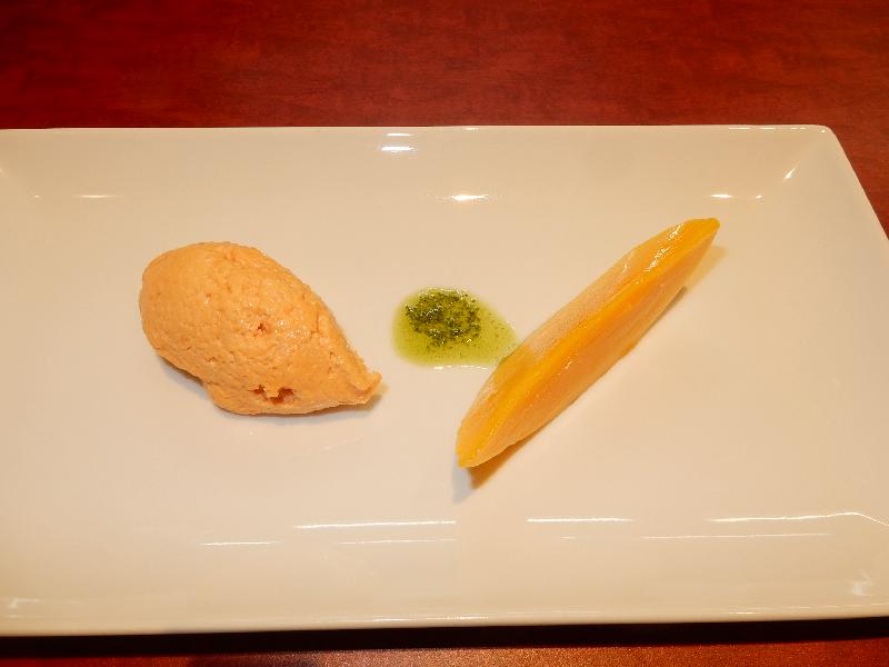 びっくりする料理です。 トマトのムースって初めての体験ですね。 ほわっとしたトマトのムースは何とも言えない優しい味で、甘みと酸味と旨味が混然一体となった複雑な味です。 とっても美味しいのですが、トマトと聞かずにいただいたらトマトと分からないかもしれません。 よく熟した宮崎マンゴーもすごく美味しい。 めっちゃ甘いです。 別々に食べたあと一緒に食べましたが、一緒に食べたほうがより美味しいと思いました。 |