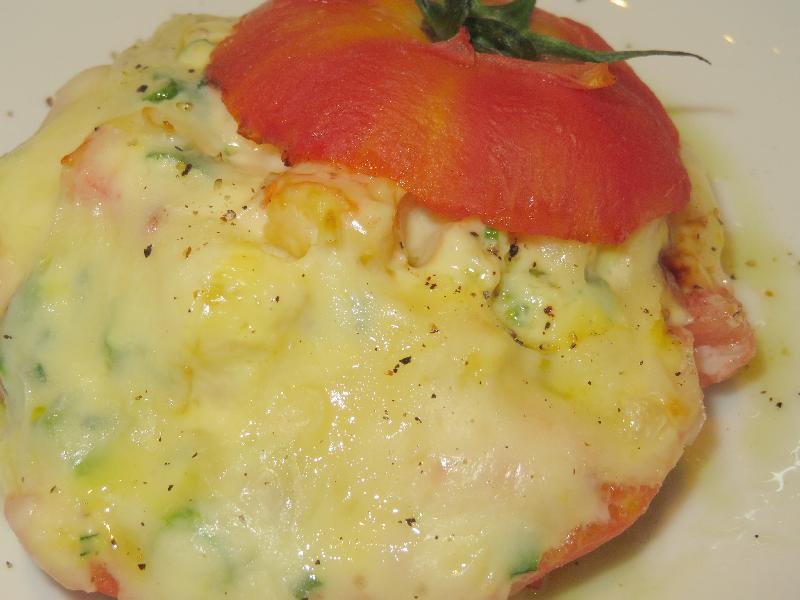 ファルシーは「詰め物」のことだそうです。 トマトを湯剥きして中をくり抜き、ホワイトソースをからめた具を詰め込んでからチーズをトッピングし、オーブンで焼き上げた料理。 具は、エビ・インゲン・アスパラ・スナップエンドウ・タケノコなどです。 食べてみると、いろいろな素材の味が混ざり合って複雑な味です。 とても美味しくて、あっという間に食べてしまいました。 |