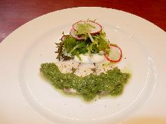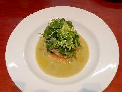 ホタテ・エビ、それにインゲン・アスパラガス・ブロッコリーを春キャベツで包み、テリーヌに仕上げた一品です。 添えてあるのは、プチトマトと自家製の生クリーム入りマヨネーズです。 この自家製マヨネーズが美味い。 お皿に乗っている全てのものにとてもよく合うんです。 |