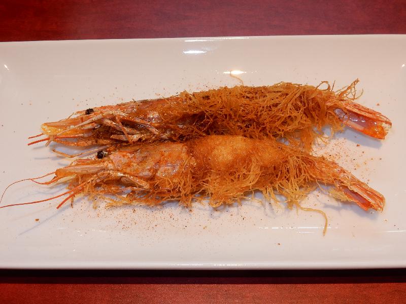 水と小麦粉から作られ、網目のように成形された生地「クナーファ」をまとわせた赤海老をカリカリに揚げた料理です。 クナーファのことをフランスではカダイフと呼ぶそうです。 カリカリに揚げてあるので、頭から尻尾まですべて食べられます。 頭や尻尾も敬遠しないで食べてみてください。 尻尾は海老せんのようで特に美味しくいただけました。 |