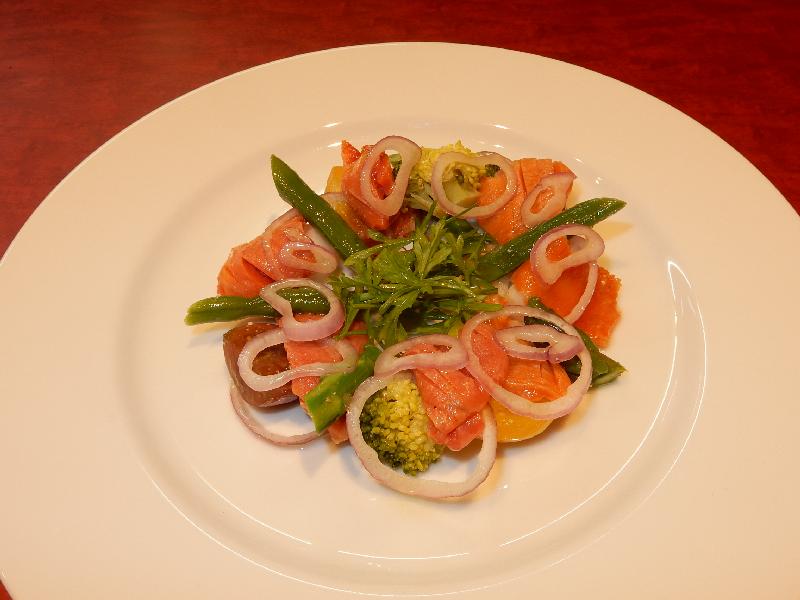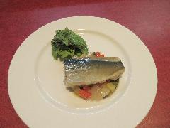 塩レモンに漬け込んだサンマの切り身を中心に、いろいろな野菜をあしらったオードヴルです。 この日の野菜は、インゲン、トマト、ブロッコリー、アスパラ、オクラ、イタリアンパセリでした。 それにグレープフルーツも入っています。 夏にぴったりのさっぱりした一皿ですね。 トッピングのサンマの皮の素揚げが香ばしいアクセントになっていて美味しいです。 |