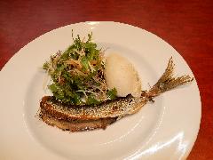 コンフィーは、低温の油(他の液体の場合もあり)でゆっくり加熱調理し、そのまま冷やして保存する調理方法です。 冷蔵・冷凍技術の無かった時代に、食べ物を長期保存するために考案されたらしいです。 コンフィーにした鮎は、頭も骨も丸ごと食べられます。 面白いのは添えられたソース。 おろした胡瓜をベースに味を調えたソースで、鮎によく合います。 |