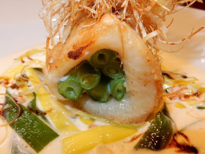 イカ・ホタテ・エビをすり身にし、スルメイカの胴体に詰めて蒸した料理です。 添えてあるのは、ホワイトアスパラガス・インゲン・プチトマト、カブ・ブロッコリーです。 イカの詰め物はめっちゃ美味しいです。 イカそのものも美味しいですが、中のすり身もいいですね。 イカの耳としっぽの素揚げも、香ばしくてスパイシーで美味しいです。 |