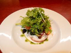 黒ミル貝のスライスに、アスパラ、インゲン、ミニトマト、ブロッコリー、カブ、スライスオニオン、コショウ菜を添えた一品。 酸味のきいたドレッシングでまとめてあります。 柔らかなミル貝とドレッシングの相性は抜群。 あっさりしていて、あっという間に食べ終えてしまいました。 |