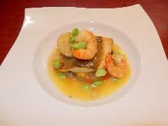 大ぶりの鰆の切り身をソテーし、インゲン・葉物野菜、それにホタテ貝柱・エビを添えた料理。 旬の鰆だけあってすっごく美味しいですね。 ソテーするときに使われているバターの香ばしさが、さっぱりした鰆の味を下から支えている感じ。 ボリュームも満点だし、メインにしても遜色ない一皿ですね。 |