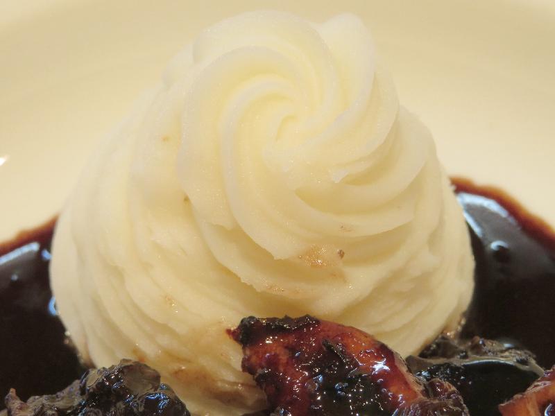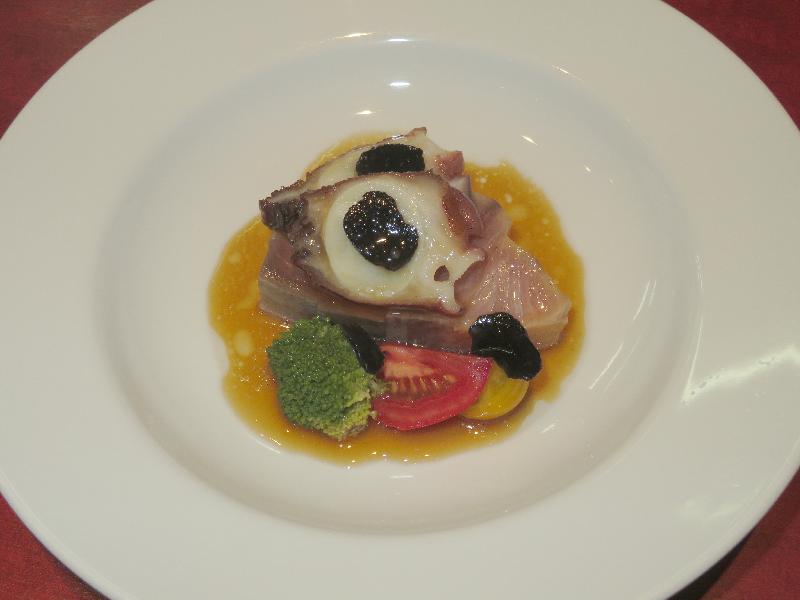 新鮮なスミイカを軽くソテーし、オーブンで焼き上げた料理です。 胴体とゲソは別々に料理してあり、胴体部分にはインゲンが詰められ、ゲソにはシイタケ、ブラウンマッシュルーム、シメジが合わせてあります。 以前のふうじん時代からの定番メニューですね。 スミイカは柔らかで、かば焼きのたれをベースにバルサミコを合わせたソースととってもよく合っています。 胴体部分も美味しいですが、イカ好きの私はゲソのほうをより美味しく感じました。 |