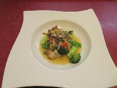 焼きネギを並べた上にじっくりソテーした真鱈のソテーを乗せ、野菜たっぷりの餡をかけた料理です。 全体に優しい味で、白子の味を楽しめますね。 餡がまたいい。 ふうじんさんに通っている方ならお分かりと思いますが、あの出汁の味です。 |