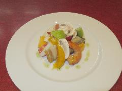 スモークした海老・ホタテ・牡蠣に、プチトマト・スライスマッシュルーム・キウイフルーツ・オレンジ・イチジク・柿を合わせたサラダ風の一品。 甘いフルーツ、フレッシュな野菜、塩の効いた燻製の取り合せがとてもいいです。 さっぱりしていて、とっても美味しい。 |