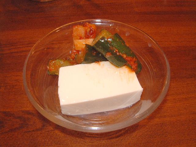 これはお豆腐とキムチです。 ちょっと辛めのキュウリと大根のキムチは、しゃくしゃくと歯ごたえがいいですね。 |