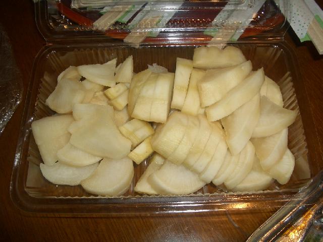 この料理を食べたときは誰も食材が分からず、「これは麺だ」 とか 「何かの内臓?」 などと勝手な意見が飛び交いました(笑 食感は 「ちょっとぼそぼそした麺」 と言う感じですが、慣れると美味しいものです。 酢をきかせたドレッシングで和えてあり、サラダ感覚で食べられます。 ダイエットにも最適な料理ですね。 |