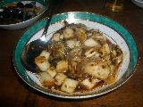 とても薄味ですが、数日前から水で戻していたホタテの干物から抜群の味が出ています。 ホックリした蓮の実が舌触りのアクセントになっています。 |
