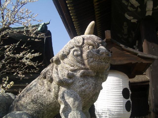 いやぁ、きれいなもんですね。 みごとです。 来てよかった!!。 へぇ、梅園もあるんだ。 あ、別料金なのね。 別にいいや、その辺にたくさん咲いてる梅だけで十分!! 私たちは1時間ほどの間、梅を観てまわりました。 落ち着いてよく観察すると、すでに満開になっている木、7〜8分咲きの木、まだ5分も開花していない木などいろいろあるものですね。 日当たりの多い少ないだけが、開花に差がつく原因ではないようです。 微妙な環境の違い、木の種類の違いなどで違いがでてくるのでしょう。 梅の季節に京都を訪れるのは初めてです。 こんなにきれいなら、もっと早く来ればよかった・・・ そうそう、狛犬を見てたら角が生えてるのがいました。 初めて見ましたが、こういう狛犬もいるんですね。 |